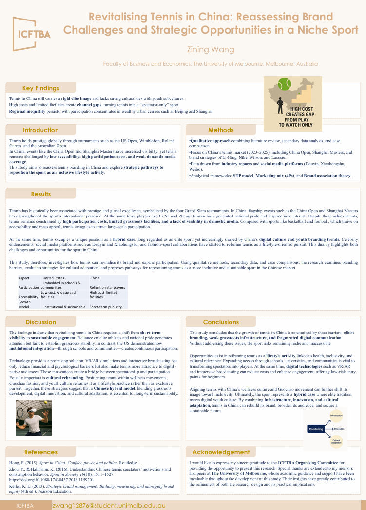 During the online session of ICFTBA 2025, there will be a poster session which allow for a larger number of authors to share their research. The poster session will provide an opportunity for researchers to present their work in a visual and interactive way, allowing for more engagement and discussion with other attendees. Authors of qualified papers will be invited to present their works with digital posters. Accepted posters can be seen on ICFTBA 2025 official website. We believe that this online poster session will still be a great platform for participants to share, discuss, and cooperate. Hope you may enjoy the ICFTBA 2025 online poster session!